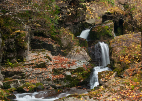 高山市朝日町。カクレハ高原キャンプ場の奥にあるイノシシ滝。二又川上流の岩井谷にかかっている。