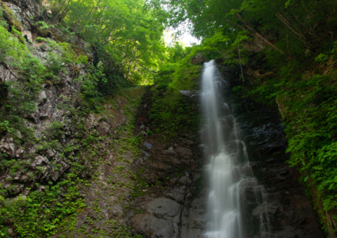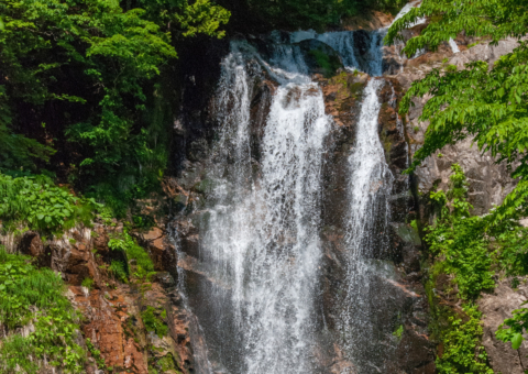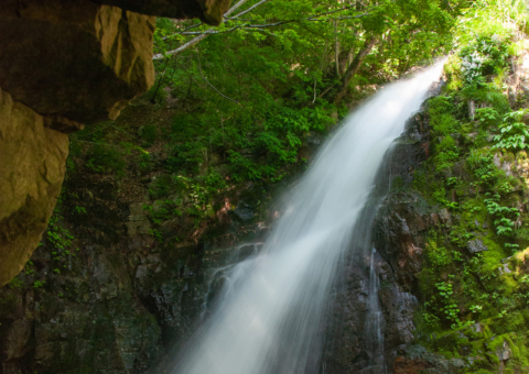 白川村。木滝谷にかかる高滝。木滝・中滝と合わせて「天生三滝」といい、最上流に位置するのがこの天生高滝だ。遠望でしか見られないことから神秘性も際立っている。